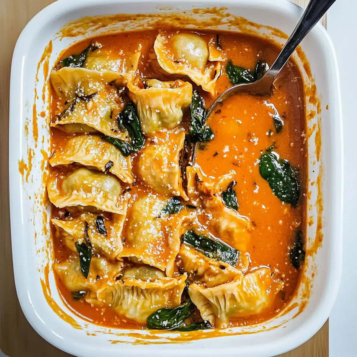 Once your sauce is mixed, layer a handful of fresh spinach directly over the sauce in the casserole dish. This addition not only adds a splash of color but also enriches the dish with nutrients. Make sure the spinach is spread evenly to provide a nice bed for the baked dumplings.