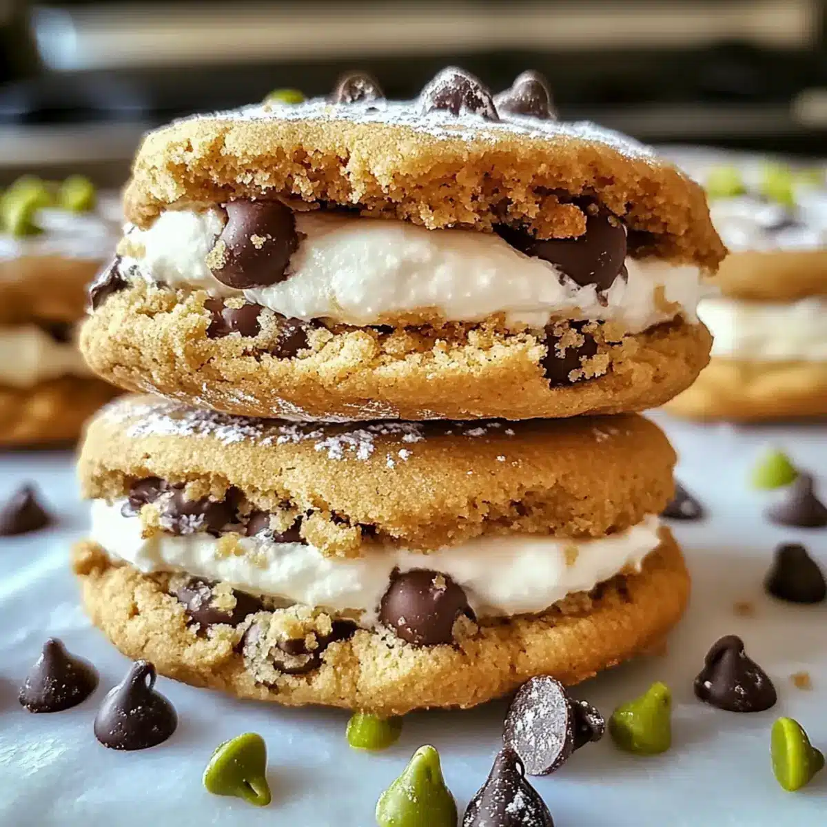 - Spread cannoli cream filling on one cookie, top with another, and optionally roll edges in chocolate chips or pistachios.
