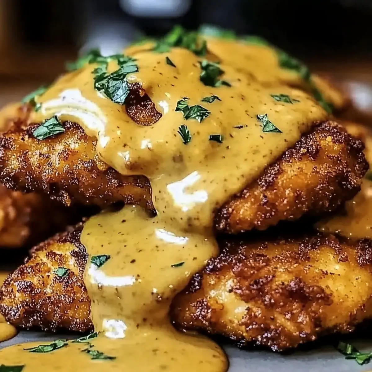 Crispy Pretzel Chicken with Mustard-Cheddar Sauce Delight