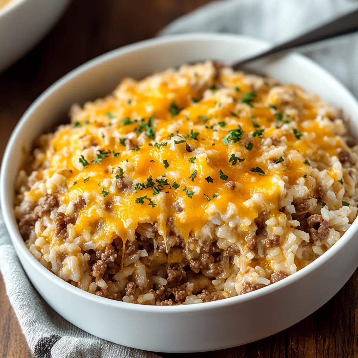 Once out of the oven, let the Cheesy Ground Beef and Rice Casserole cool slightly. If desired, sprinkle some chopped parsley over the top for a fresh finish before serving. Dish it up hot and watch your family enjoy this comforting meal!