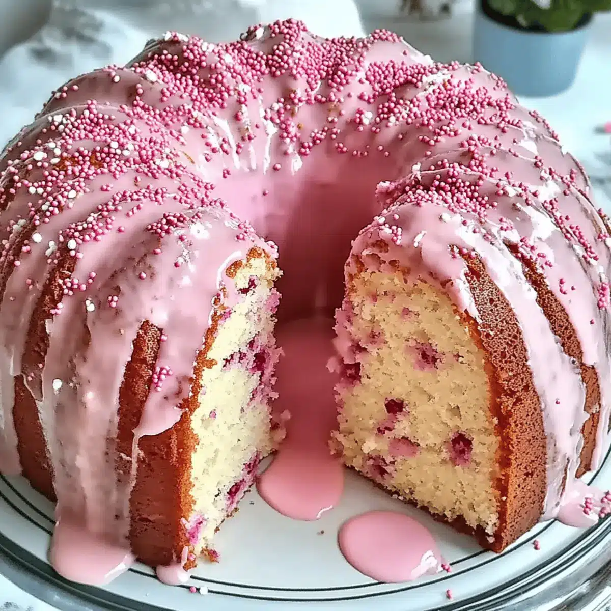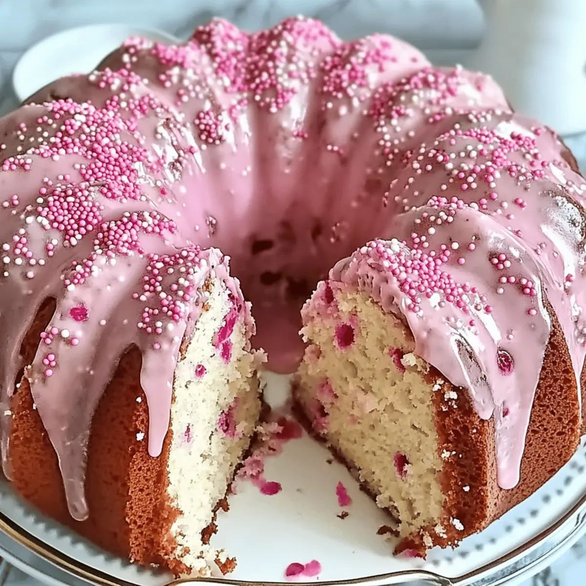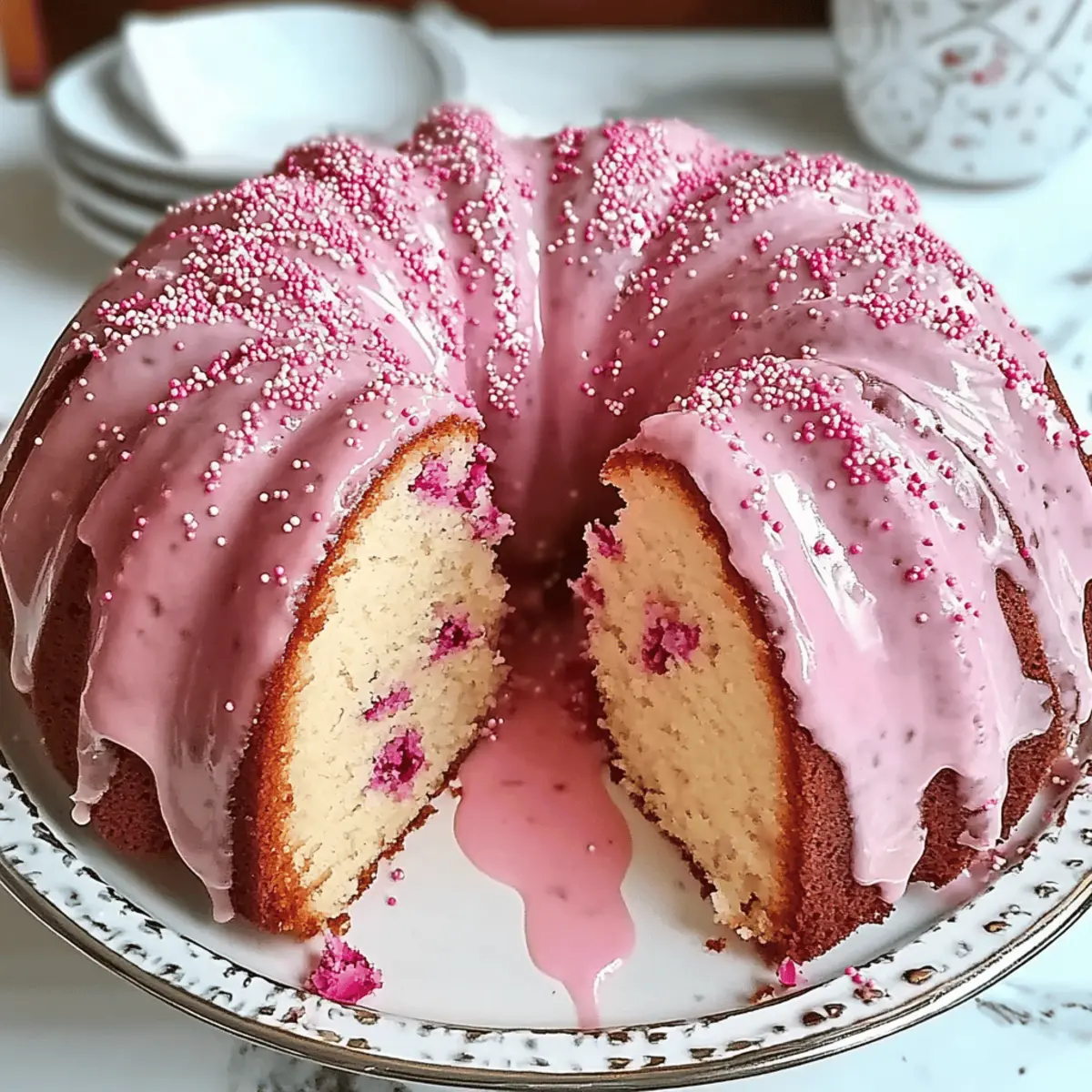 Finally, pour the glaze generously over the cooled Cherry Blossom Bundt Cake, allowing it to cascade down the sides. Once glistening with glaze, finish by decorating the cake with your homemade pink sprinkles for a pop of color and whimsy. This stunning presentation is sure to impress at your spring gatherings!