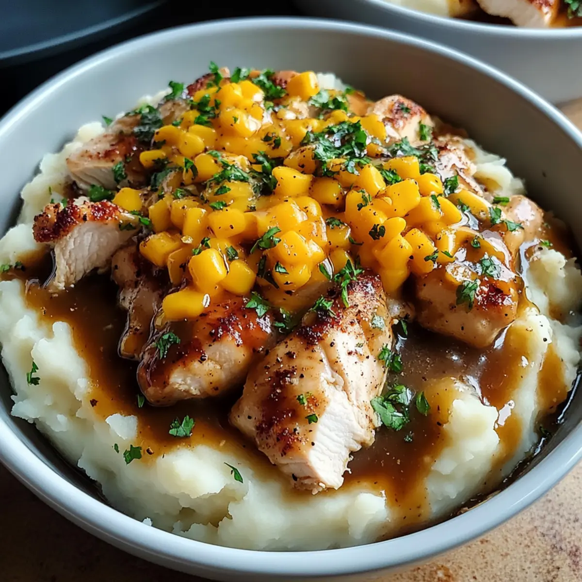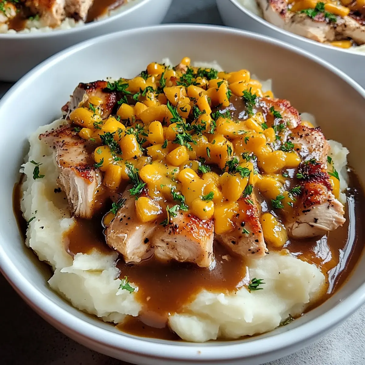 - Start with a scoop of hot mashed potatoes in each bowl, layer with corn, and then add seared chicken.