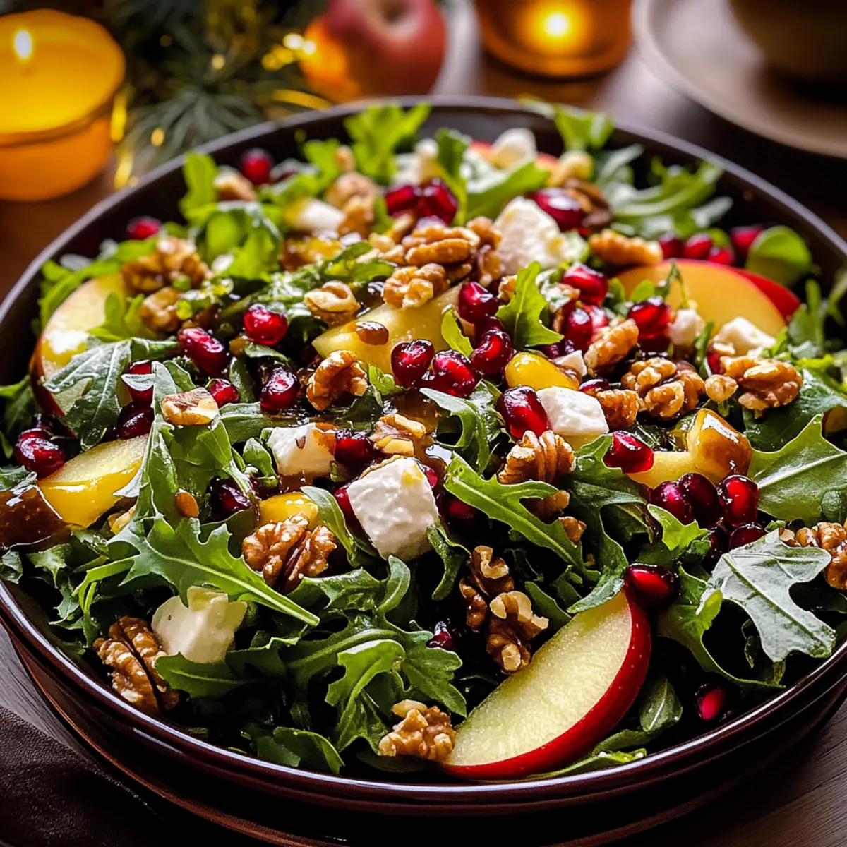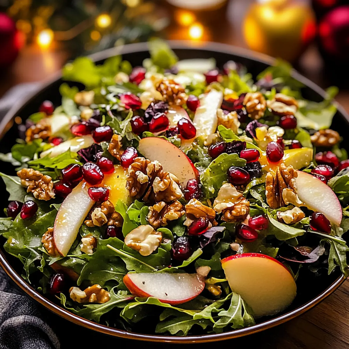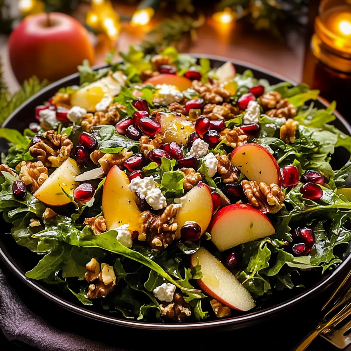 Vibrant Colors: This salad is a feast for the eyes, featuring a array of fresh greens, crisp apples, and pomegranate seeds that add a festive touch to your table.