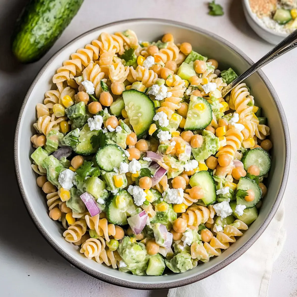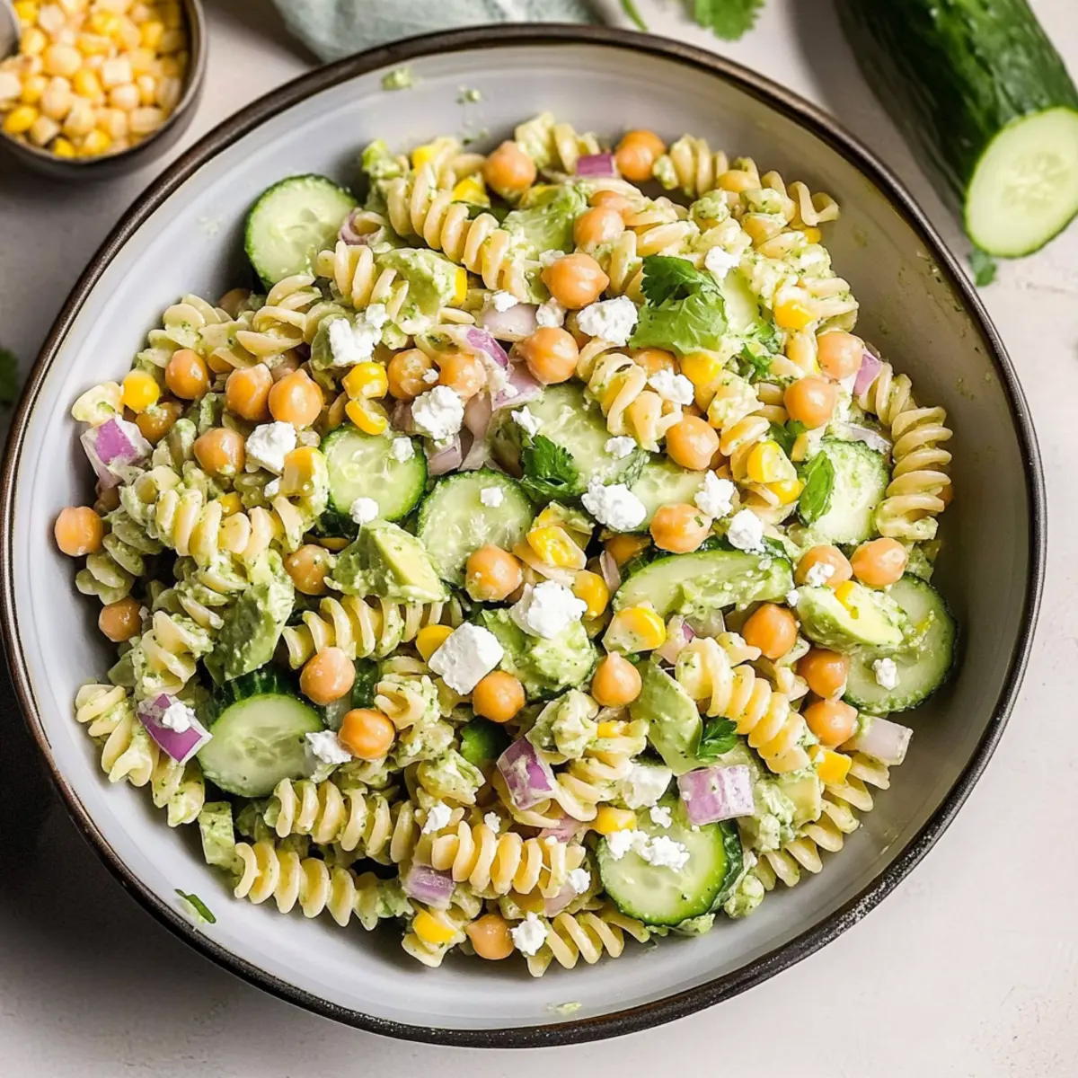 - In a mixing bowl, combine pasta, chickpeas, corn, cucumber, and red onion.