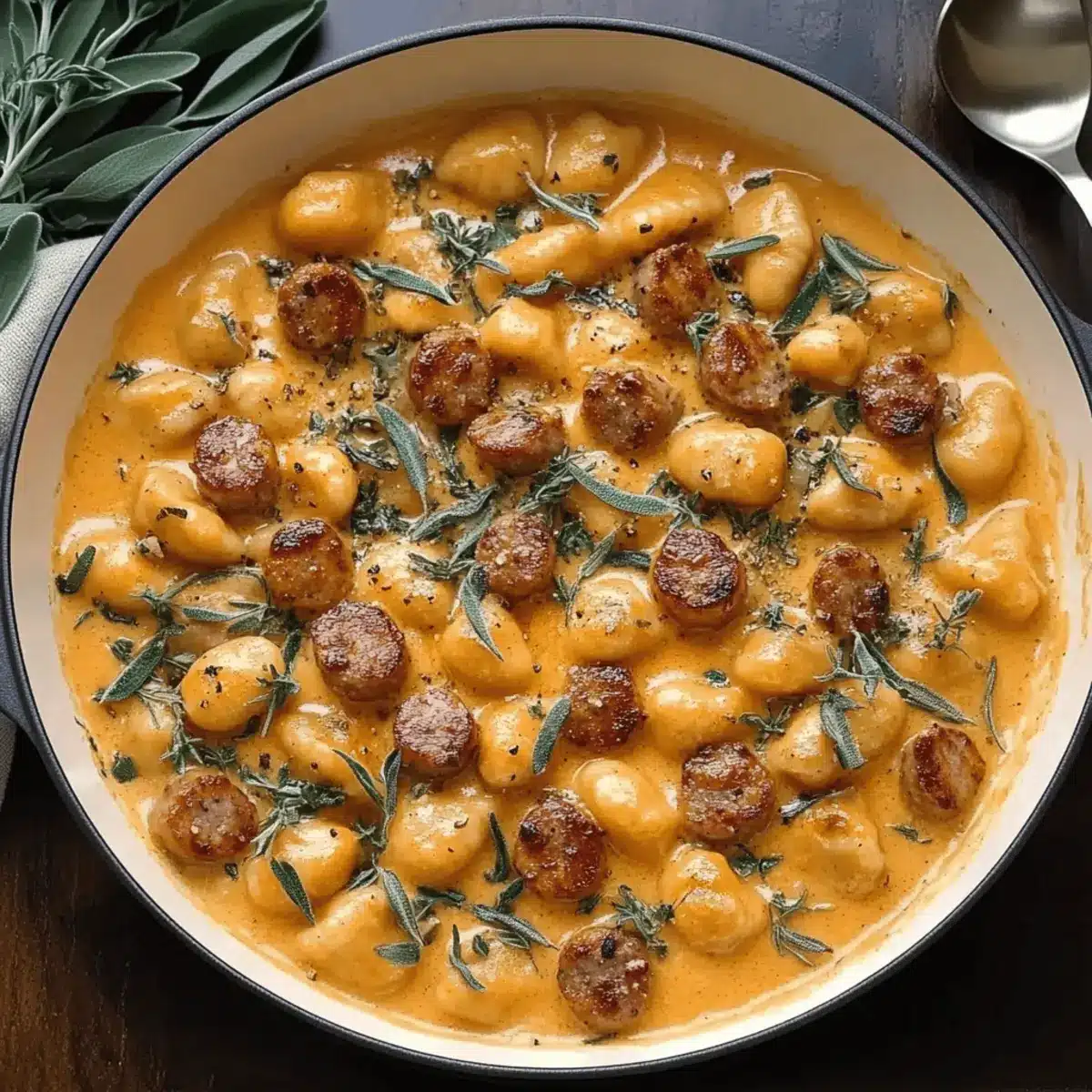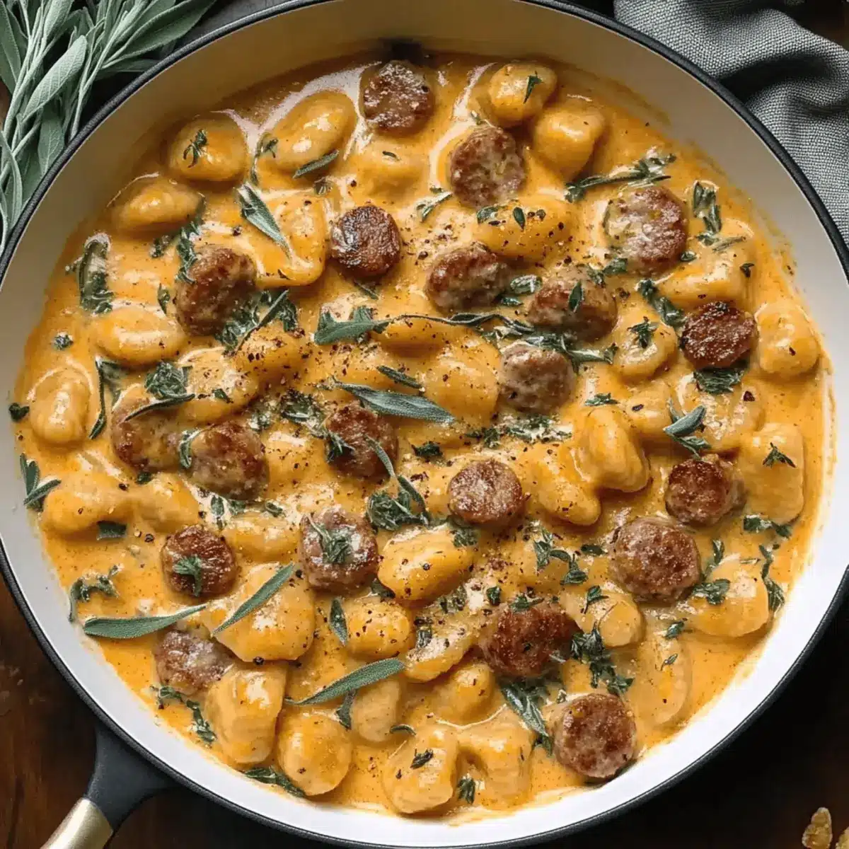 Once the gnocchi is cooked, drain it and transfer it directly into the skillet with the creamy butternut squash sauce. Add fresh sage and thyme, folding everything together gently. Season with salt and pepper to taste, allowing the flavors to meld for about 2 minutes over low heat.
