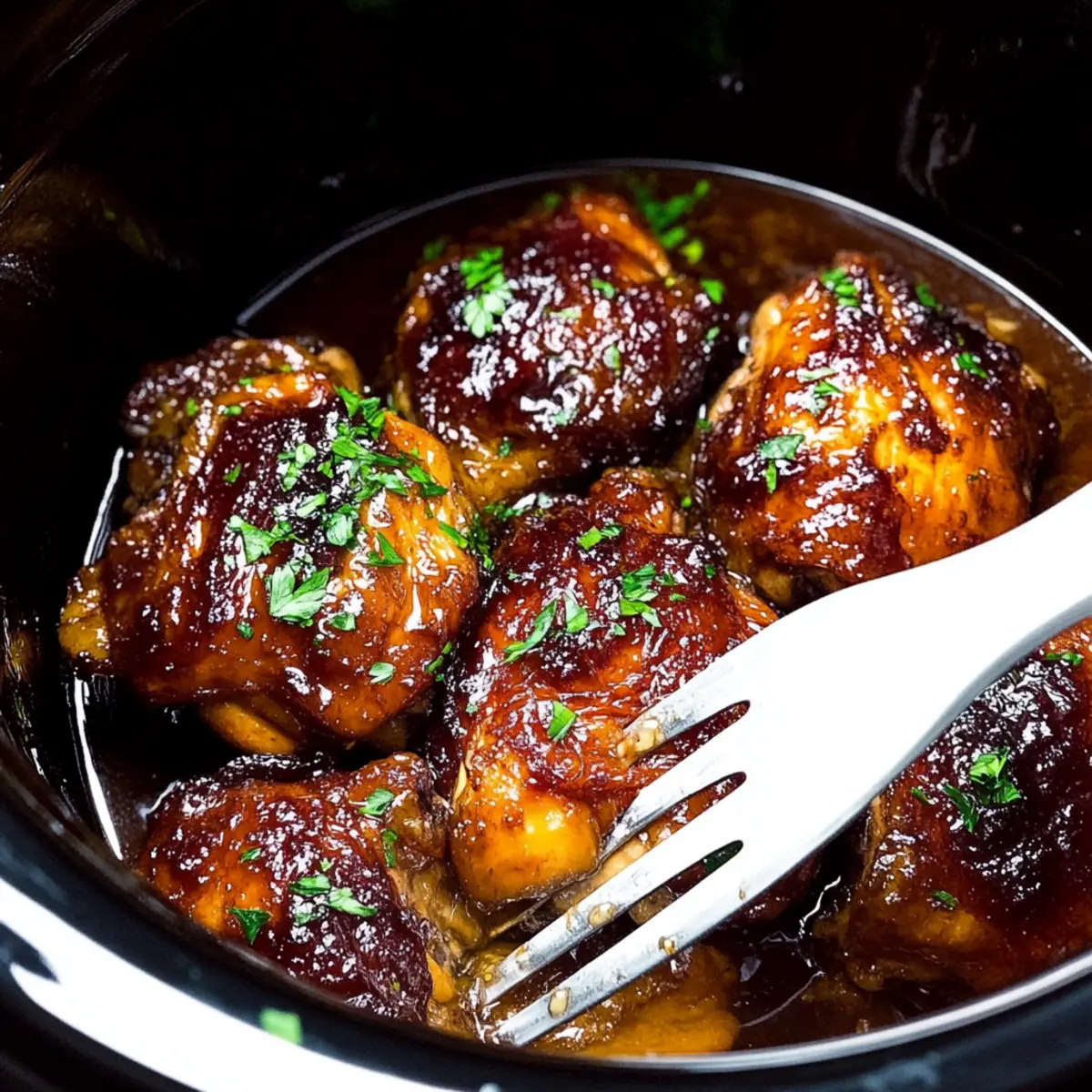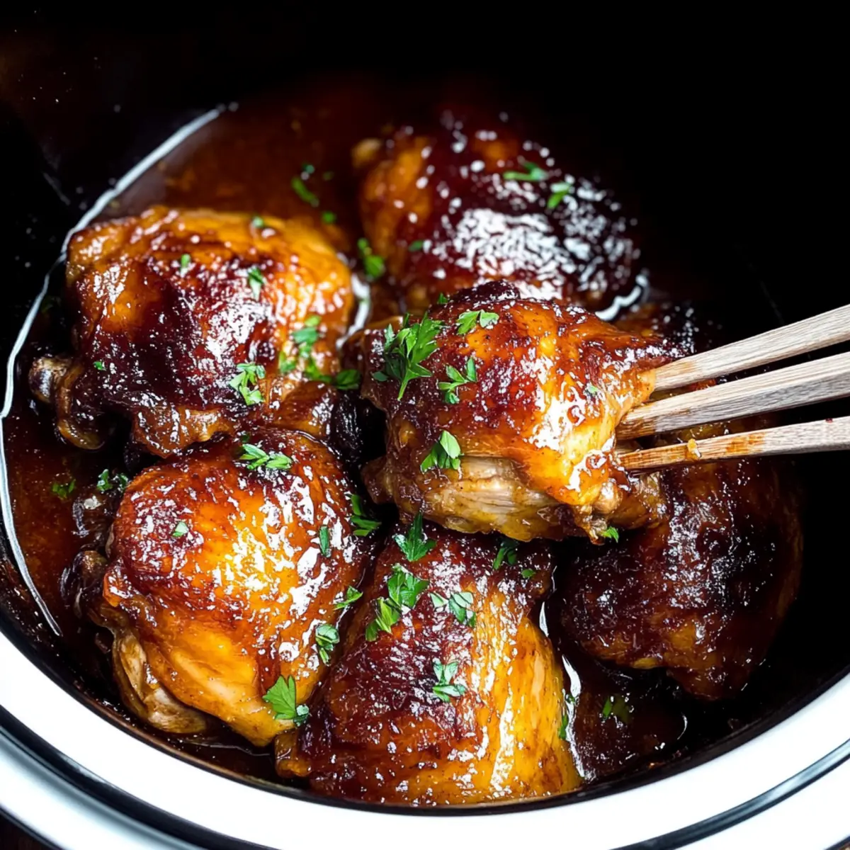 Once the chicken is seared, transfer the thighs, skin-side up, into the slow cooker. Carefully pour the prepared sauce over the chicken, ensuring each piece is well-coated. Cover the crock pot with its lid, and set it to cook on HIGH for 3 hours or on LOW for 5 hours. The chicken is done when it’s tender and easily pulls away from the bone.