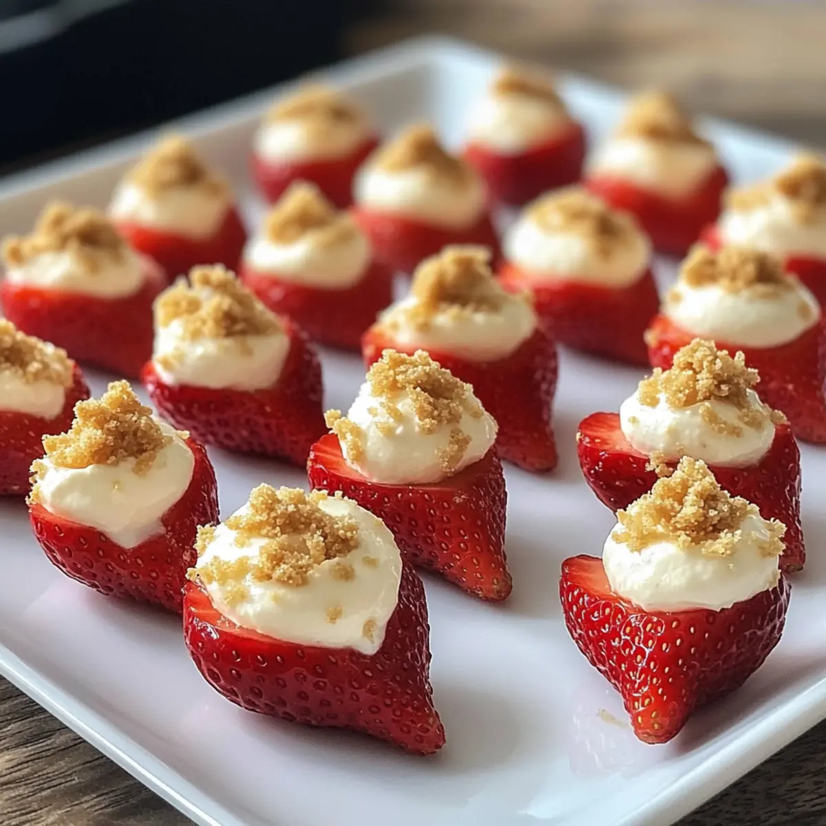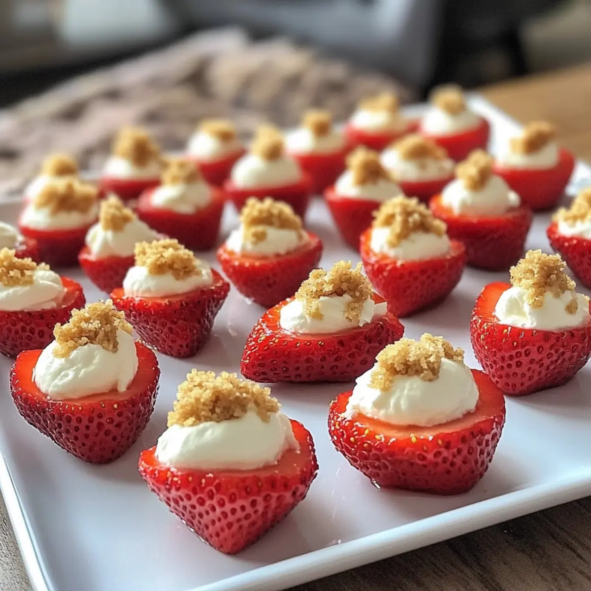 Finally, sprinkle a generous amount of graham cracker crumbs over the filling of each deviled strawberry to add a satisfying crunch. Serve your beautiful deviled strawberries fresh on a platter, allowing their vibrant colors to shine. These bites are perfect for parties and gatherings, ready to impress your family and friends with their delicious and creative presentation!
