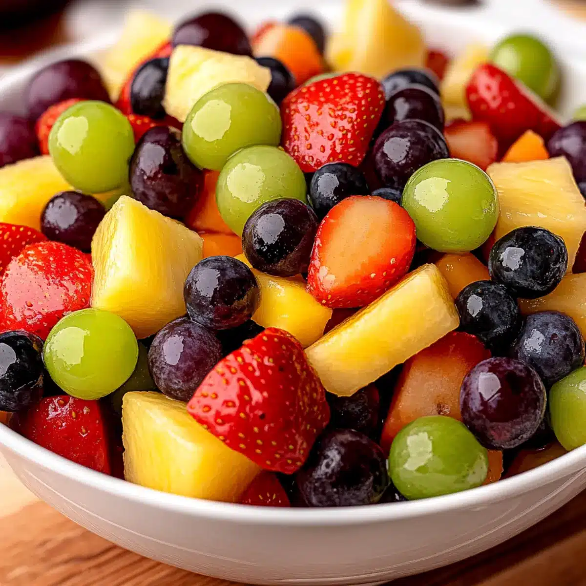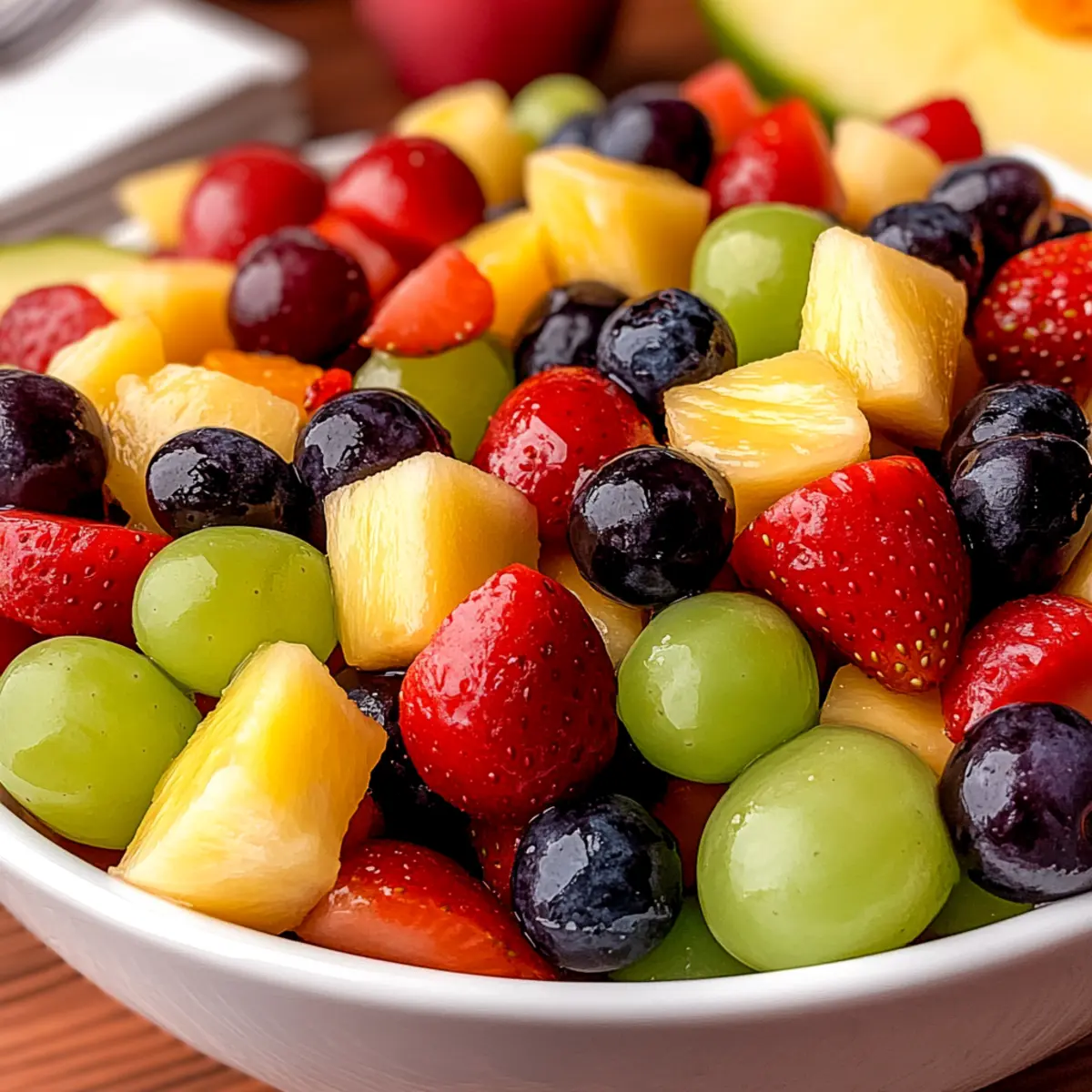 Vibrant Colors: This fruit salad is a feast for the eyes, combining various fruits that create a rainbow of colors perfect for summer gatherings.