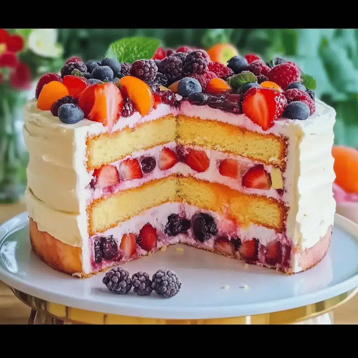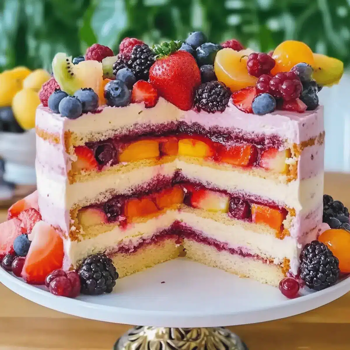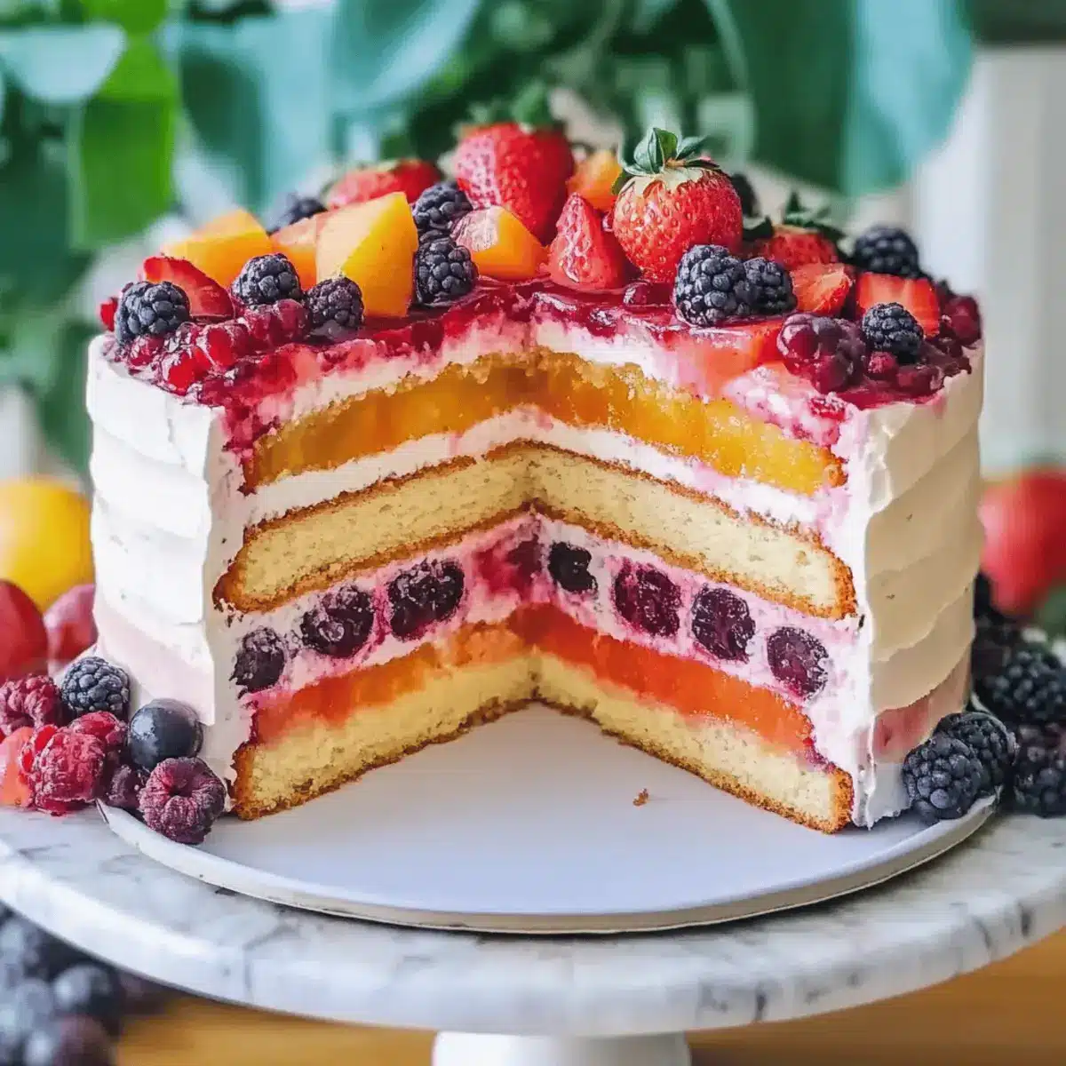 Vibrancy: The Summer Fruit Sangria Cake is a feast for the eyes, bursting with seasonal fruit colors that brighten up any gathering.