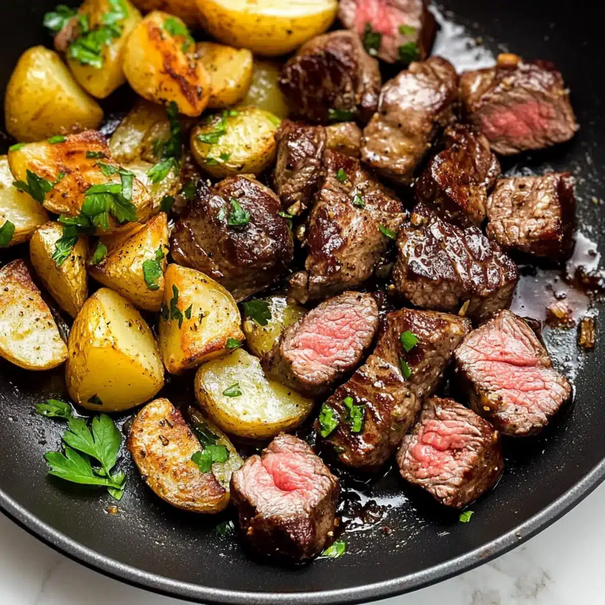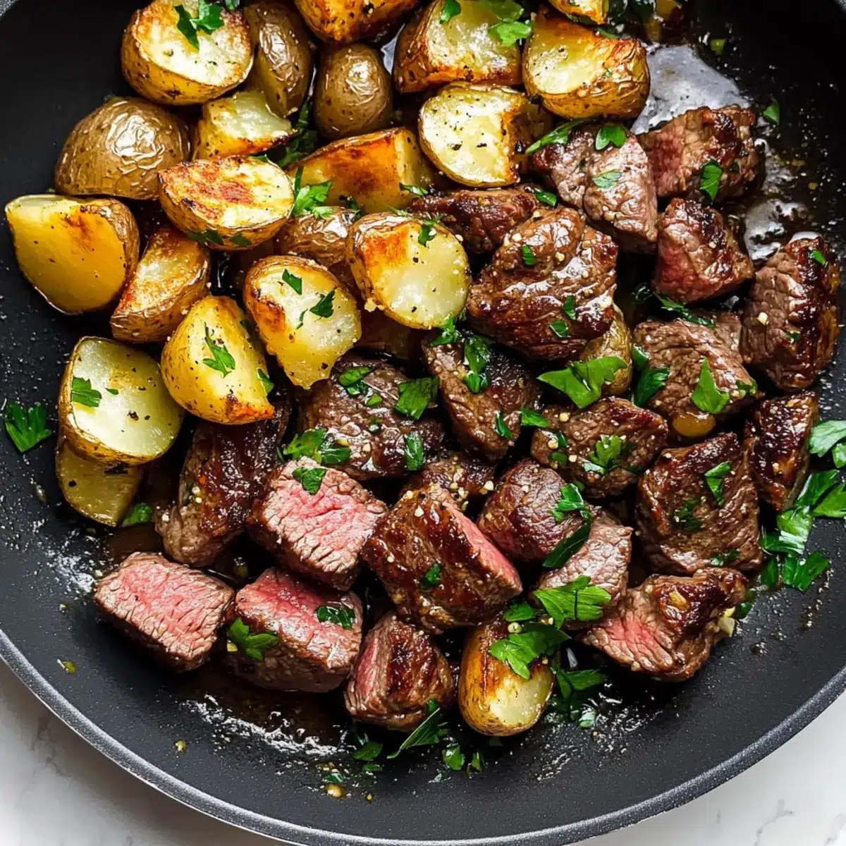 With the steak beautifully seared, return the cooked potatoes to the skillet. Gently stir to combine all the flavors and adjust seasoning as desired with extra salt and pepper. Let everything heat through for about 1-2 minutes, then remove from heat. Garnish with freshly chopped parsley for a pop of color and serve your Garlic Butter Steak Bites and Potatoes warm.