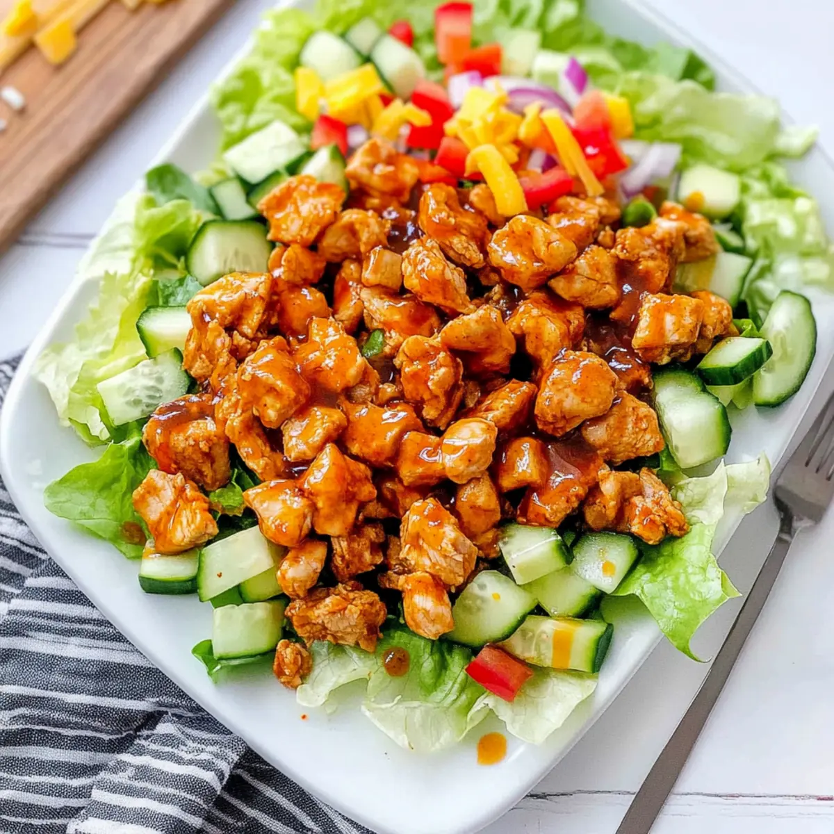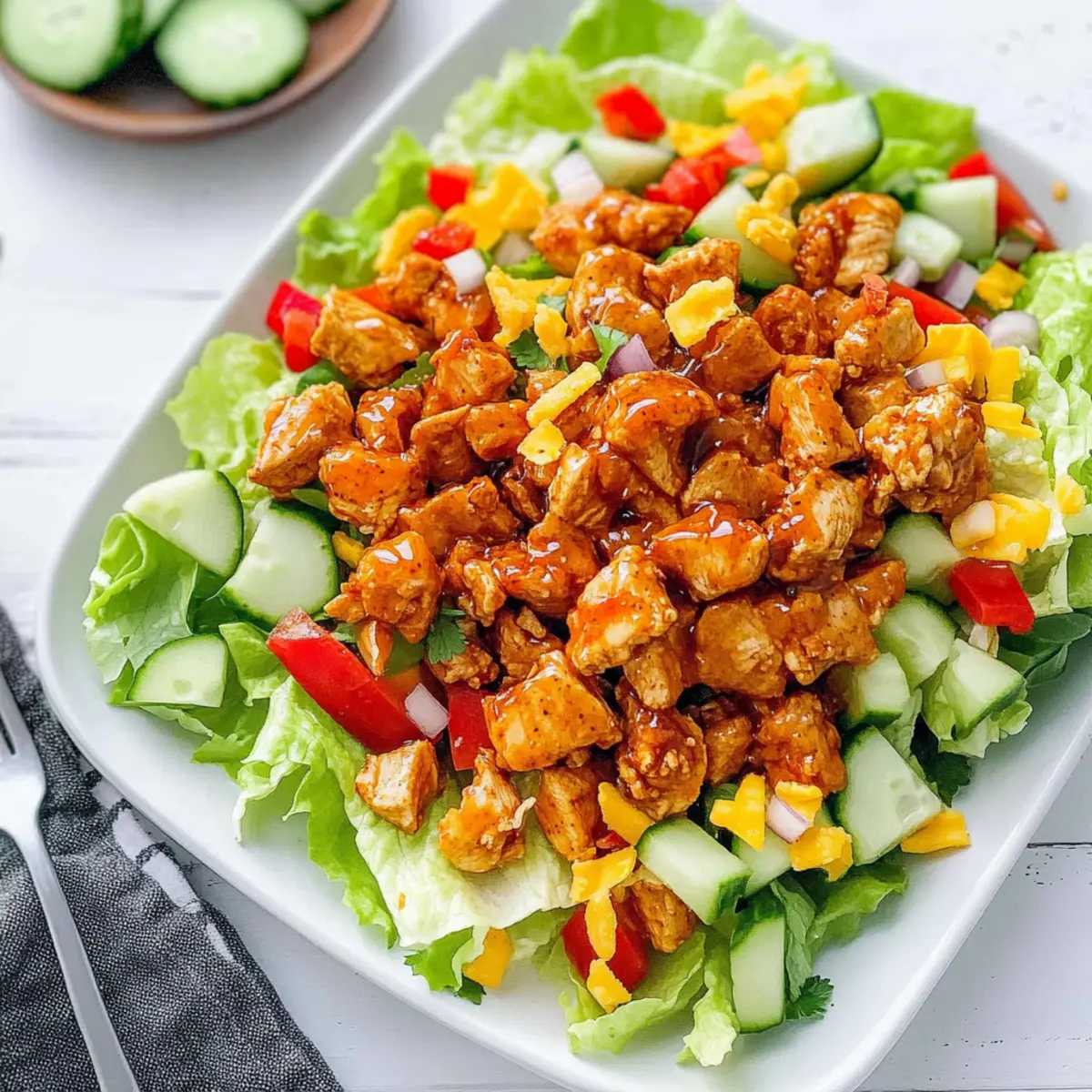 Next, top your lettuce with diced red onion, red bell pepper, and cucumber, distributing them evenly across the salad. Each veggie brings its unique crunch and flavor, enhancing the salad’s overall appeal. The popping colors create an inviting look, making your Honey Hot Chicken Salad even more enticing.