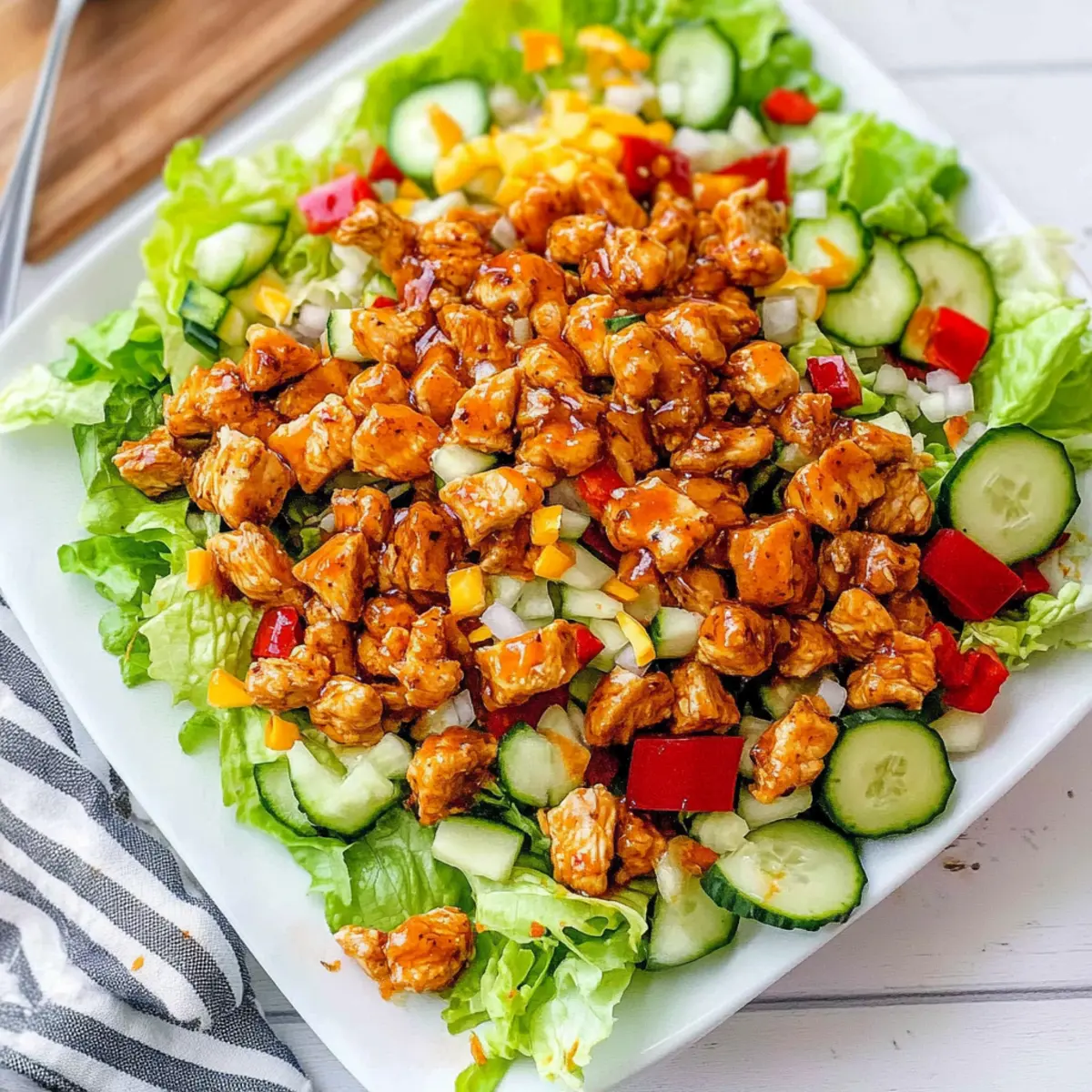 Freezer: Freezing is not recommended for the entire salad due to the risk of soggy vegetables. If needed, you can freeze the sauced chicken separately for up to 3 months.