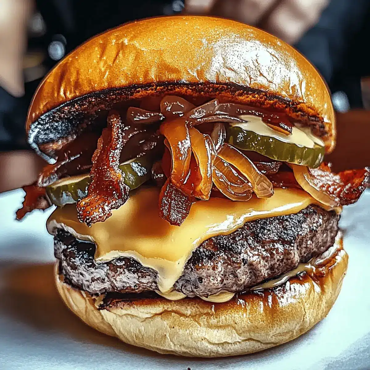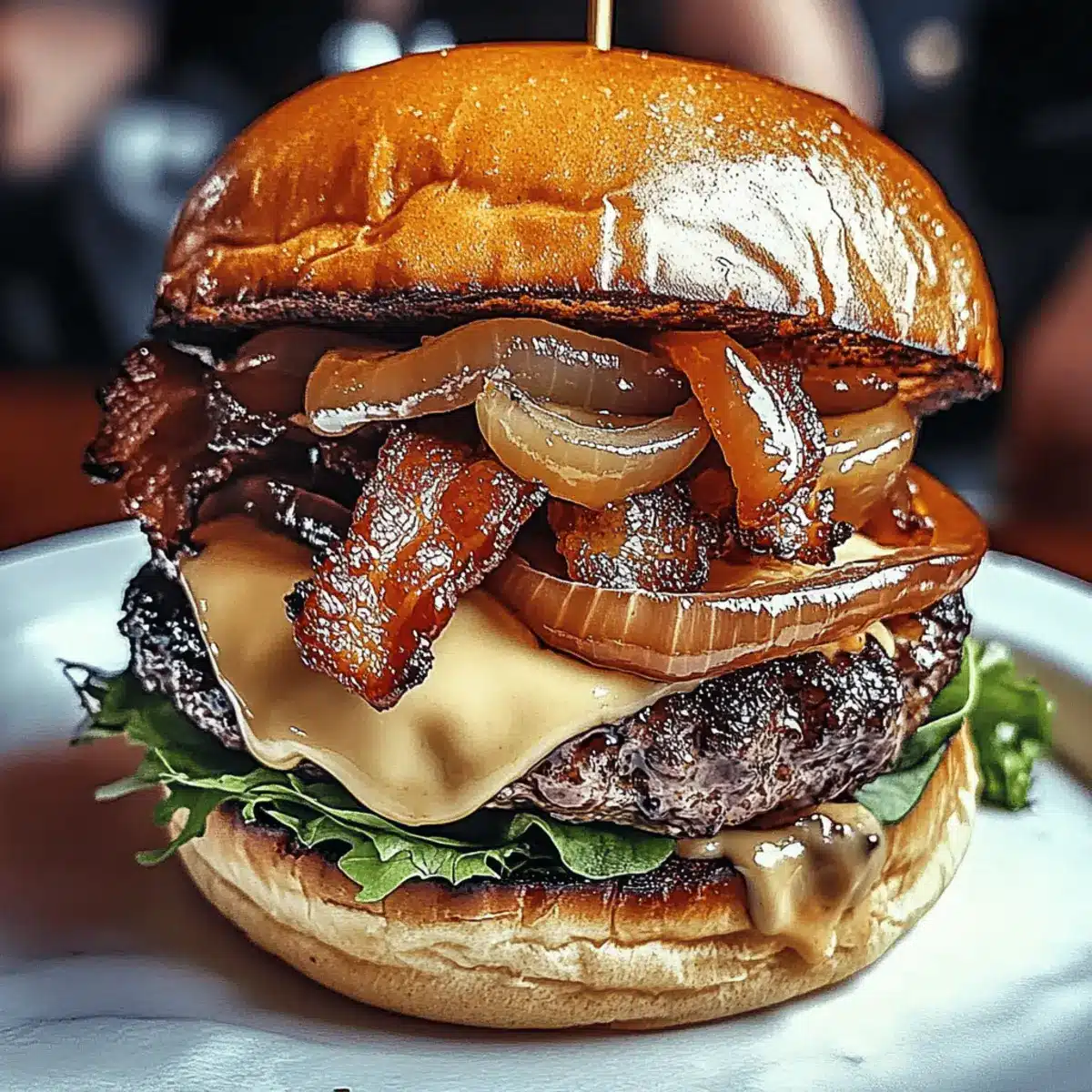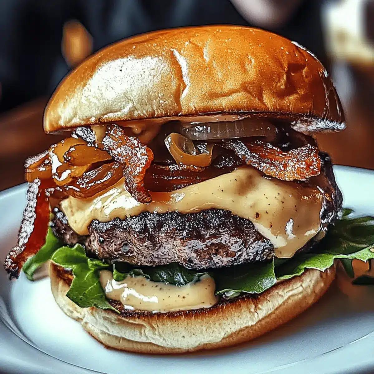 - Assemble burgers with patty, cheese, caramelized onions, bacon, and sauce on the buns.