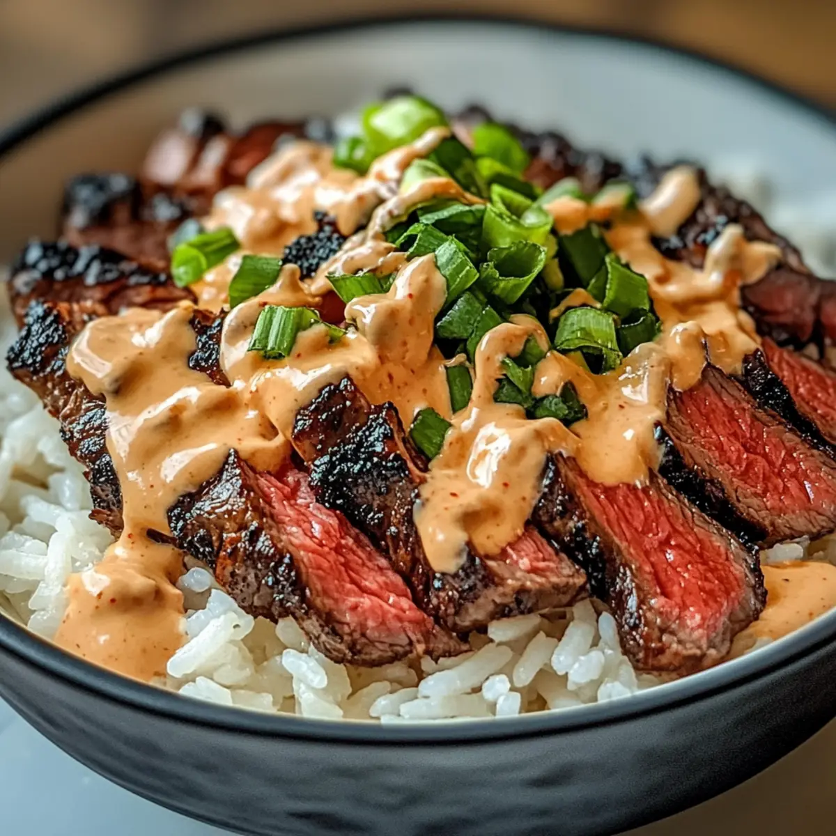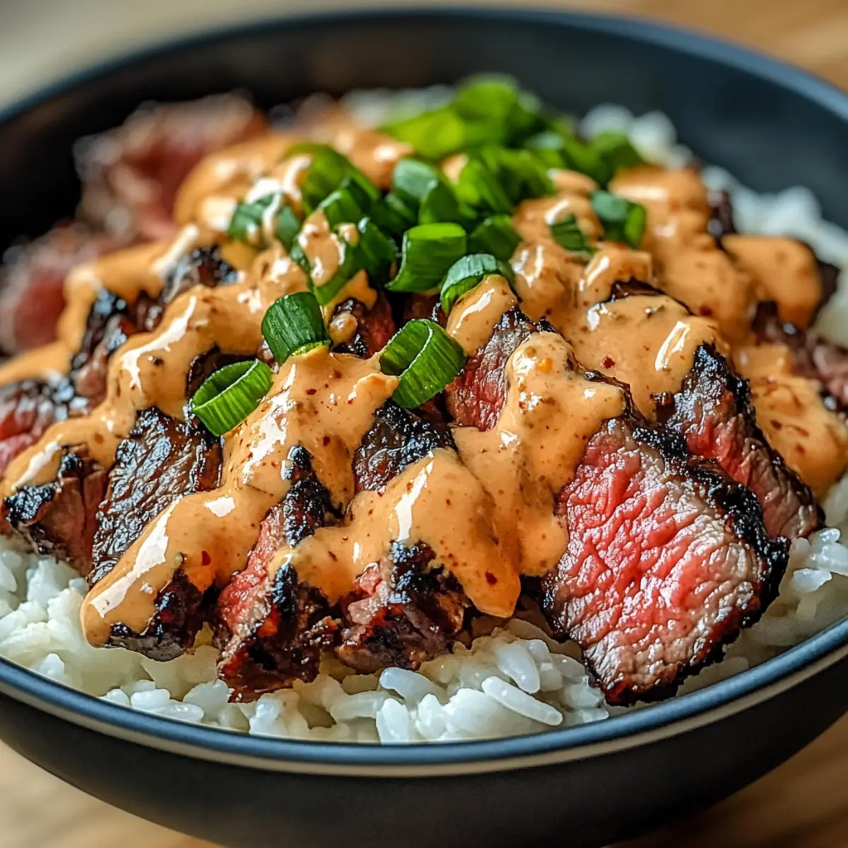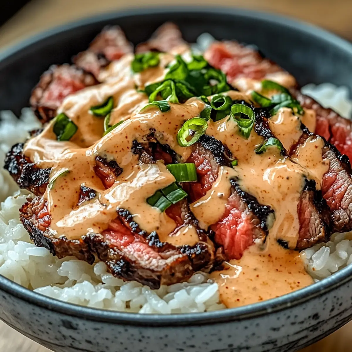 - Assemble the bowls with a scoop of rice, sliced steak, and drizzle the spicy cream sauce, finishing with chopped green onions.