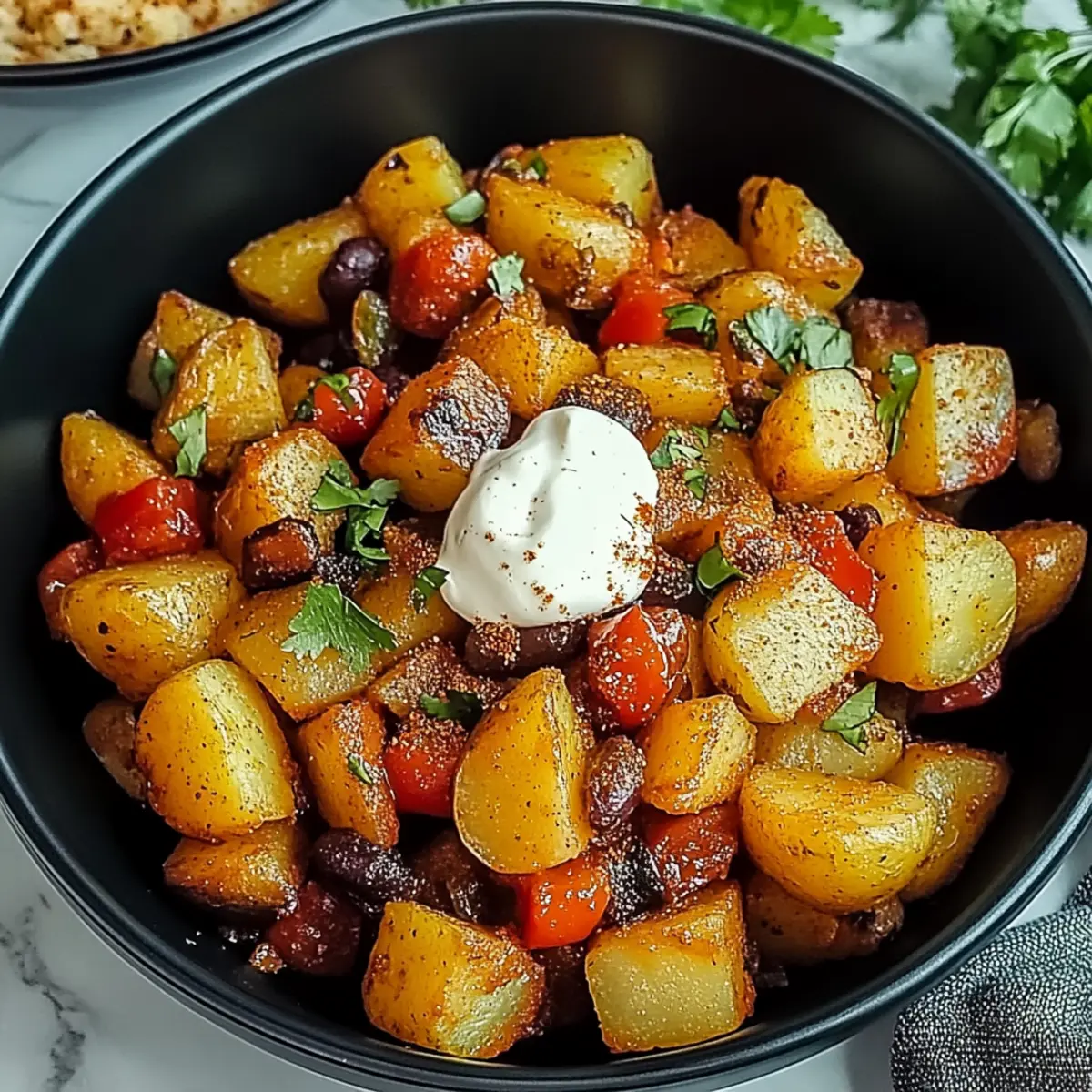 Zesty Black Bean Salad: A colorful black bean salad provides protein and freshness, balancing the rich flavors of the potatoes while adding a distinguished crunch.