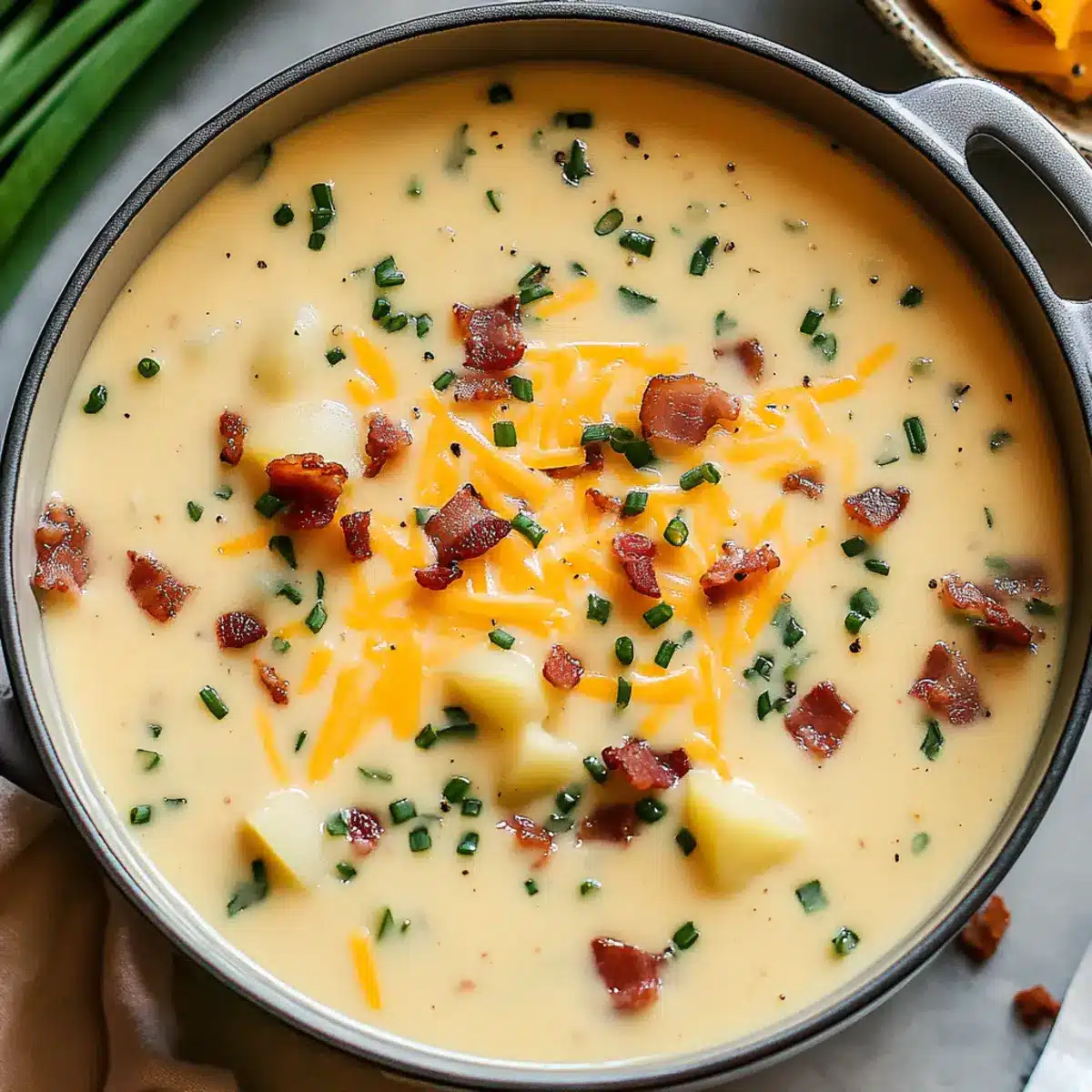 - Ladle the soup into bowls and garnish with cheddar cheese, crumbled bacon, and diced green onions. Serve hot.