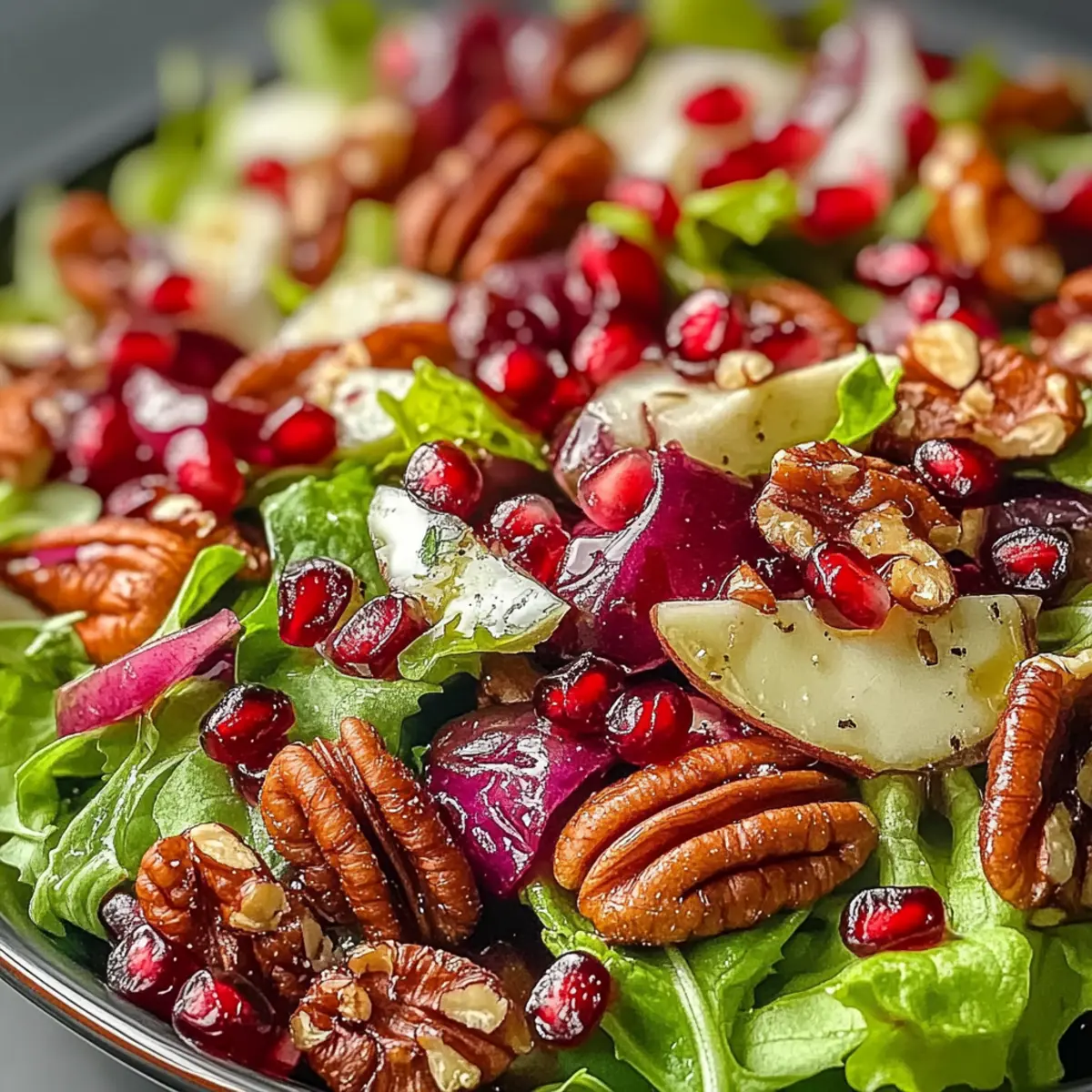 - In a large salad bowl, combine a generous handful of mixed salad greens, pomegranate seeds, toasted pecans, crumbled feta cheese, thinly sliced red onion, and apple slices. Mix well.