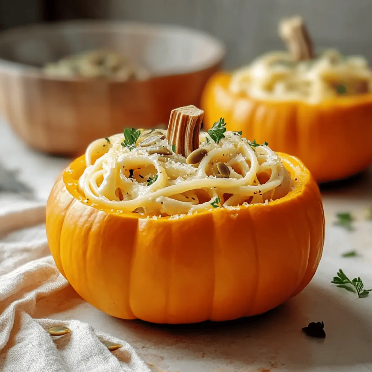 Finish by sprinkling chopped parsley, a handful of pumpkin seeds, and extra grated Parmesan over the stuffed pumpkins for a burst of color and crunch. Serve your whimsical Pumpkin Alfredo Pasta Cauldrons warm, allowing your guests to enjoy this festive fall feast in both flavor and presentation. Enjoy the cozy atmosphere you’ve created!