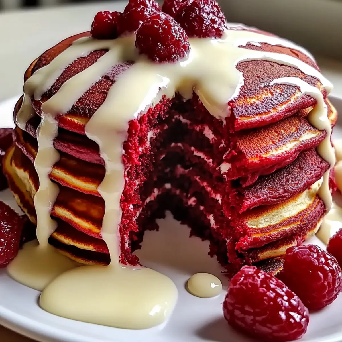 • Bring the vibrant joy of Red Velvet Pancakes with Cream Cheese Glaze to your breakfast table.