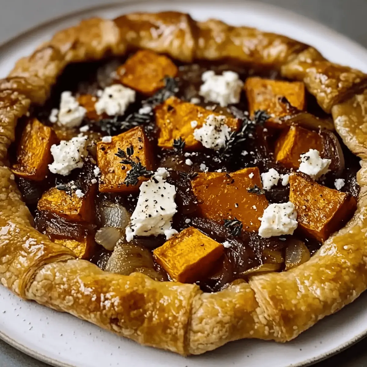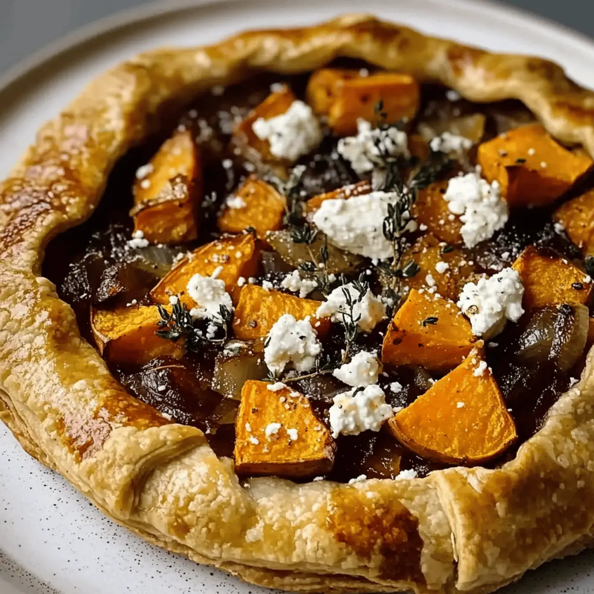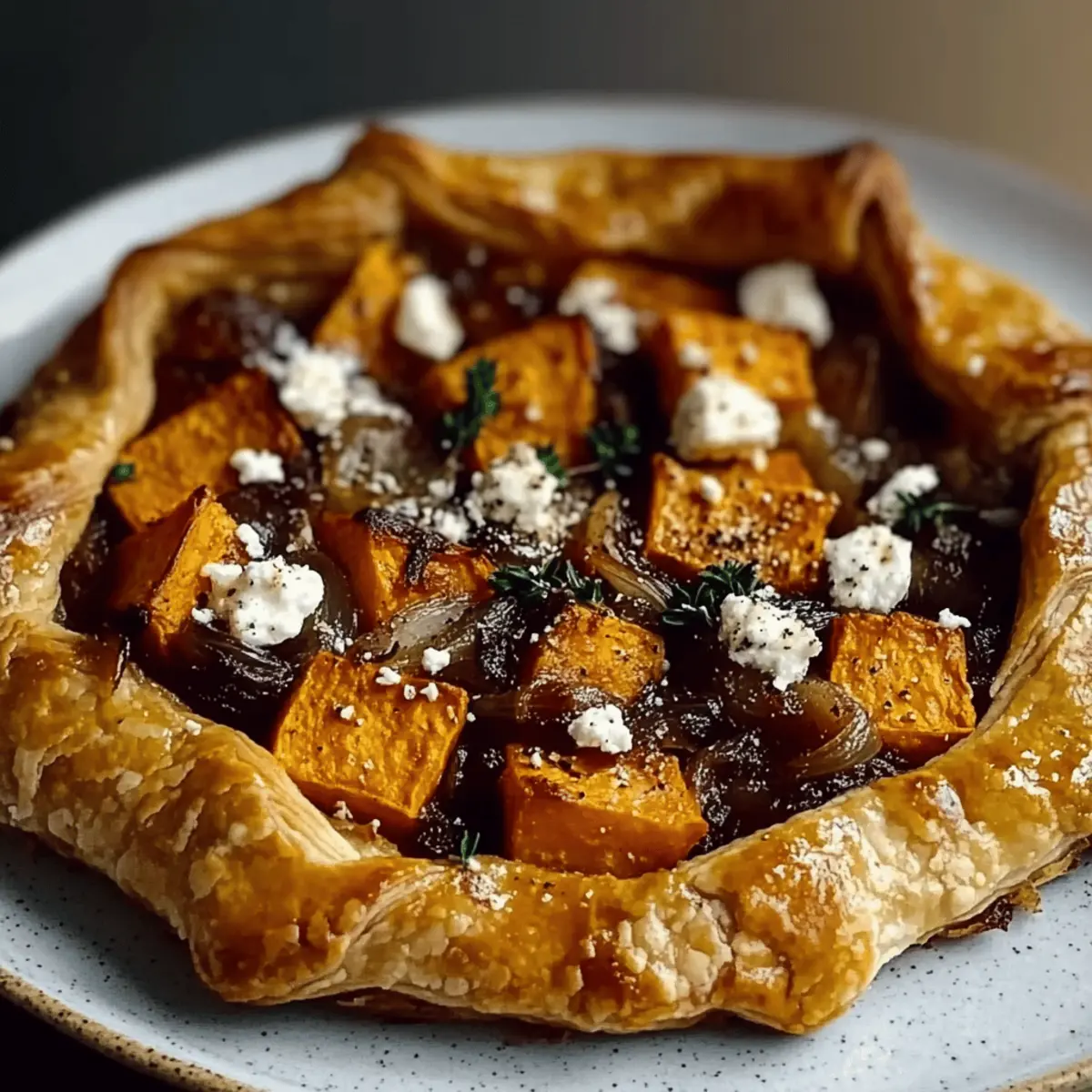 - Assemble the filling: Spread caramelized onions on the pastry, layer roasted sweet potatoes on top, crumble feta cheese, and sprinkle fresh thyme.