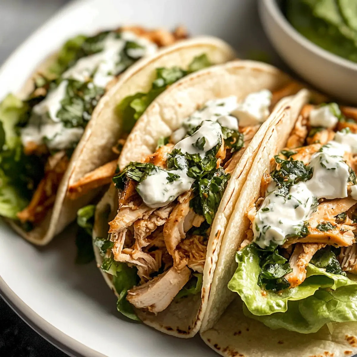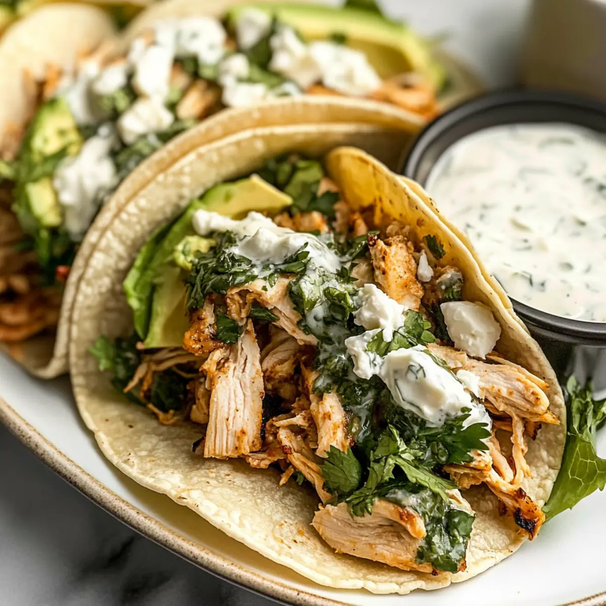 Warm the flour tortillas in a dry skillet for about 30 seconds on each side until they are pliable. To assemble, layer a generous handful of romaine lettuce on each tortilla, followed by the shredded chicken mixture. Add slices of creamy avocado and a sprinkle of feta cheese, then drizzle the prepared chimichurri sauce over the top. Serve these vibrant and delicious tacos warm for the best experience!