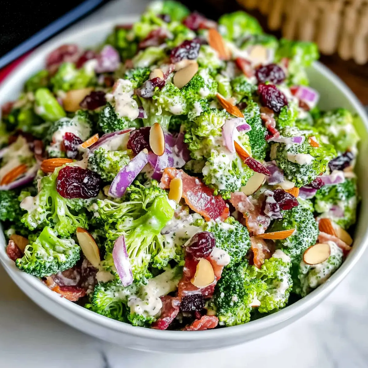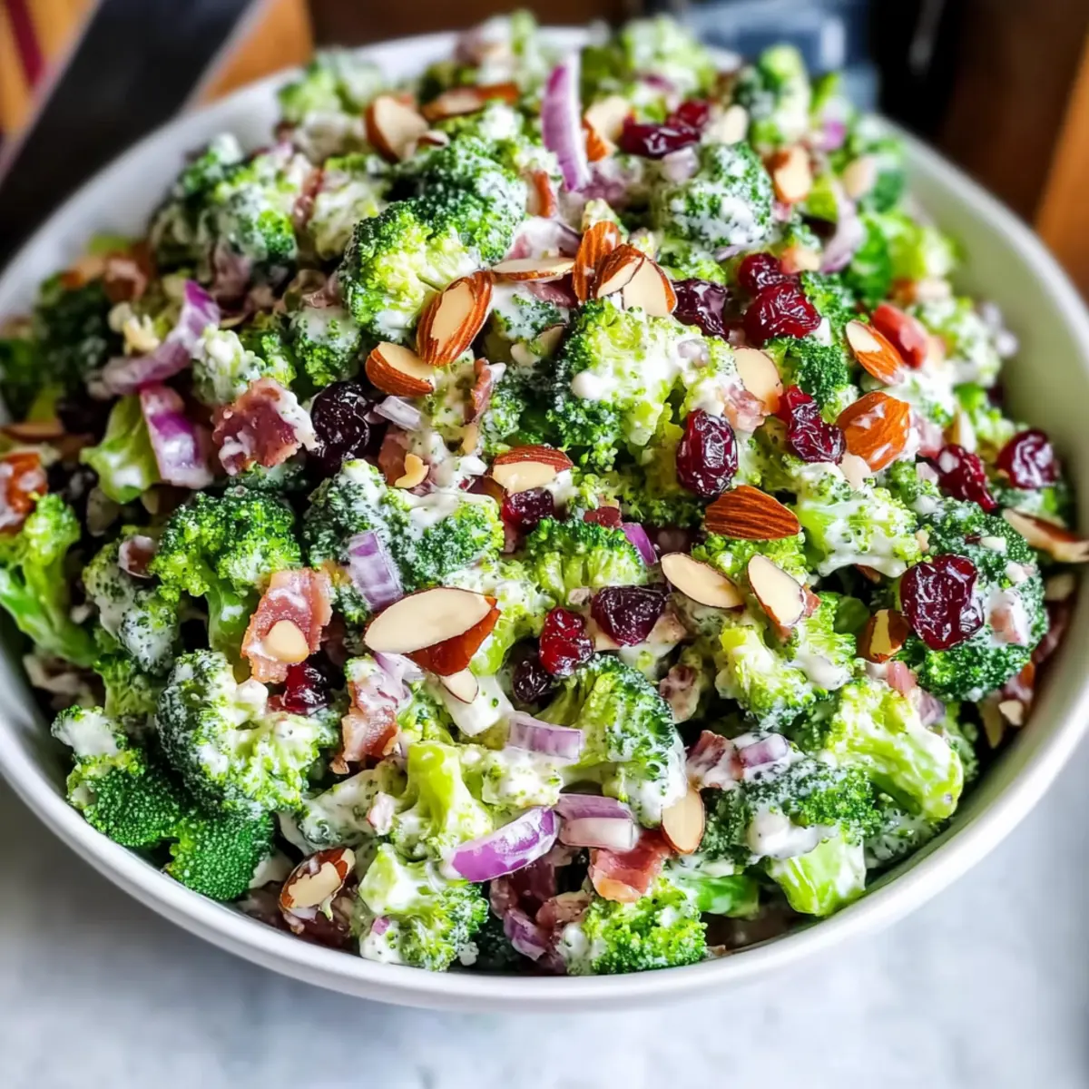 - In a large mixing bowl, combine broccoli, bacon, red onion, cranberries, and almonds. Stir gently.