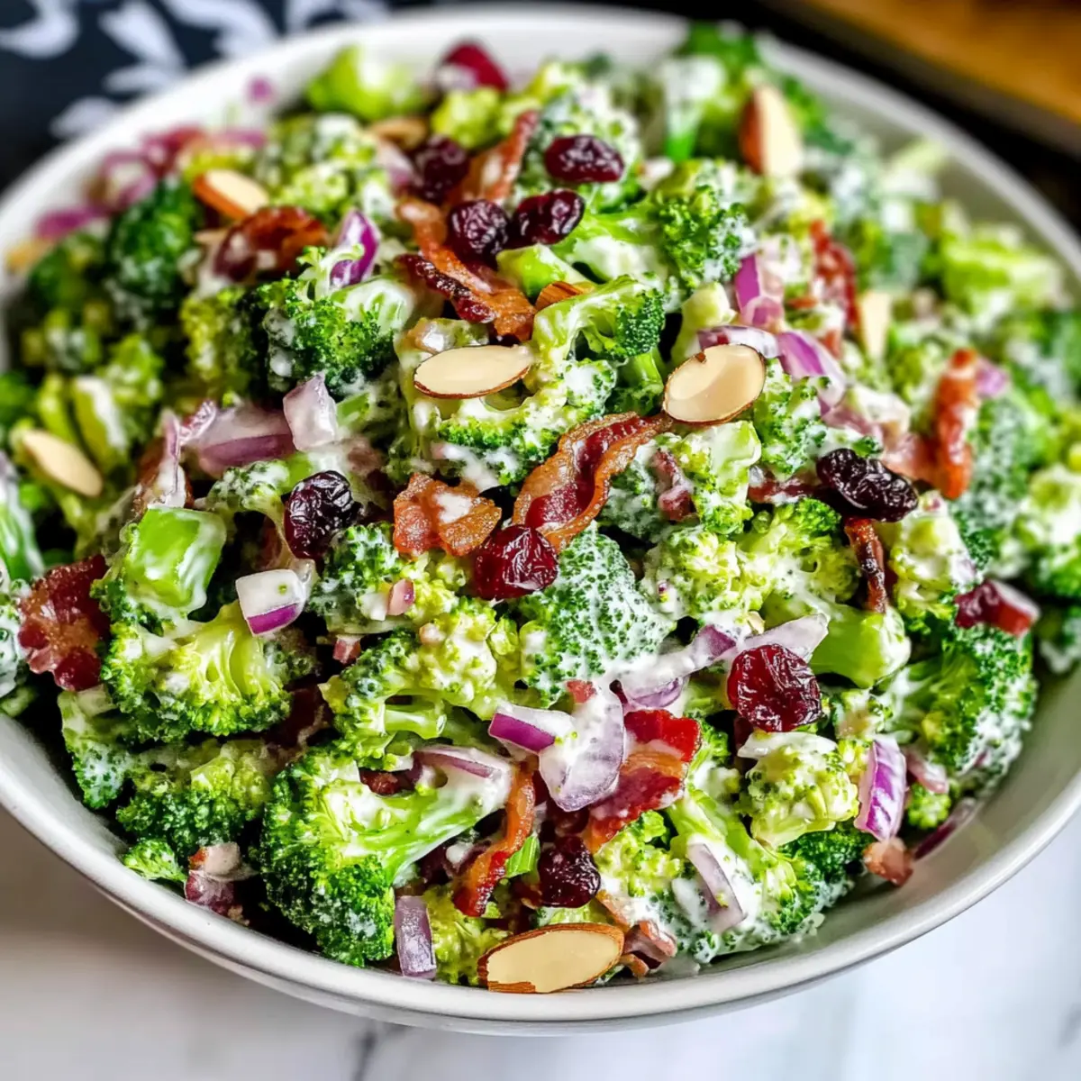Absolutely! If you’re cooking for guests with specific dietary restrictions, you can easily modify The Best Broccoli Salad. Substitute regular bacon with turkey bacon or skip it entirely for a vegetarian-friendly version. For nut allergies, feel free to replace sliced almonds with sunflower seeds or omit the nuts altogether while still keeping the salad delicious!